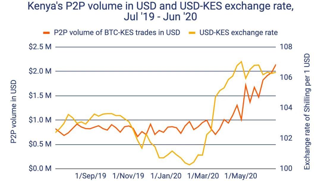 許多非洲國家的貨幣嚴重貶值和不穩定,使居民的儲蓄難以保值。例如,南非蘭特(ZAR)在過去十年中對美元貶值超過50%,一直是最不穩定的法定貨幣之一。尼日利亞、埃及、阿爾及利亞、埃塞俄比亞和加納的本國貨幣也面臨類似的問題。對于生活在這些條件下的人們來說,加密貨幣可以充當更穩定的價值存儲。從事件上看,我們已經聽到了非洲這種用例的幾個例子,我們的數據證實了這種情況很可能正在發生。下圖顯示了兩個非洲國家的貨幣貶值水平:南非和肯尼亞。下圖以一美元所兌換的本幣數量為單位--這個數字增長越快,貨幣貶值越多,同時還包含了P2P加密貨幣交易量。
