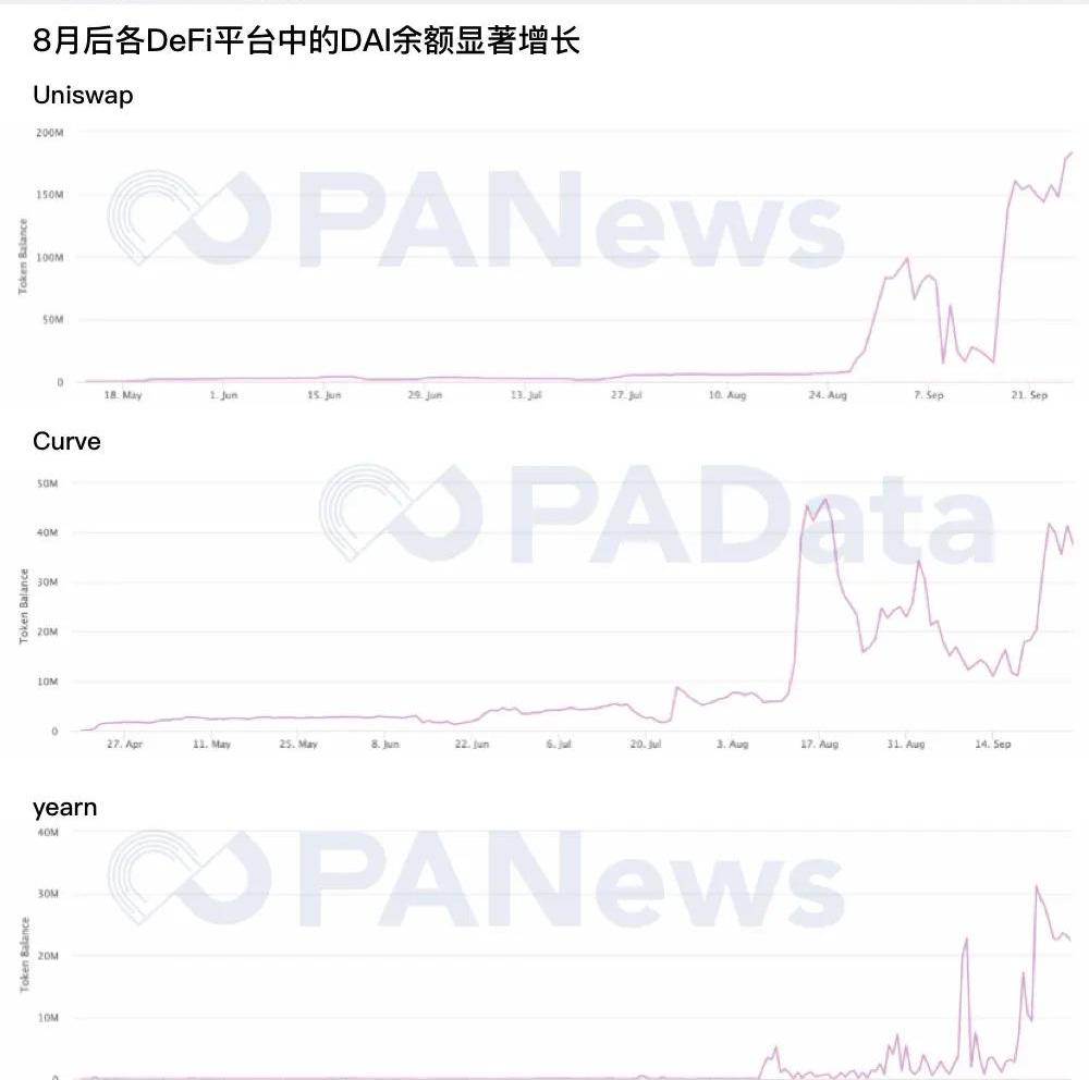 DeFi概念幣的集體上揚不僅受益于近期DeFi產品自身的創新,而且還受益于DeFi產品間的可組合性,這使得DeFi概念幣在火熱的市場中形成了正向內循環。比如以太坊DeFi的“央行”Maker,其生成的穩定幣DAI自去年下半年以后,市值排名就在50名以外,但隨著今年DeFi領域中其他產品的豐富,DAI的流通量進一步提高了。根據Etherescan的數據,目前持有DAI最多的10個地址中,有5個都是DeFi平臺,包括Uniswap、Balancer、yearn.finance、Curve和Aave。并且從余額變化趨勢來看,這些平臺的DAI余額自8月中下旬開始快速上漲,從時間上來看,這與開放DAI挖礦的時間基本吻合。