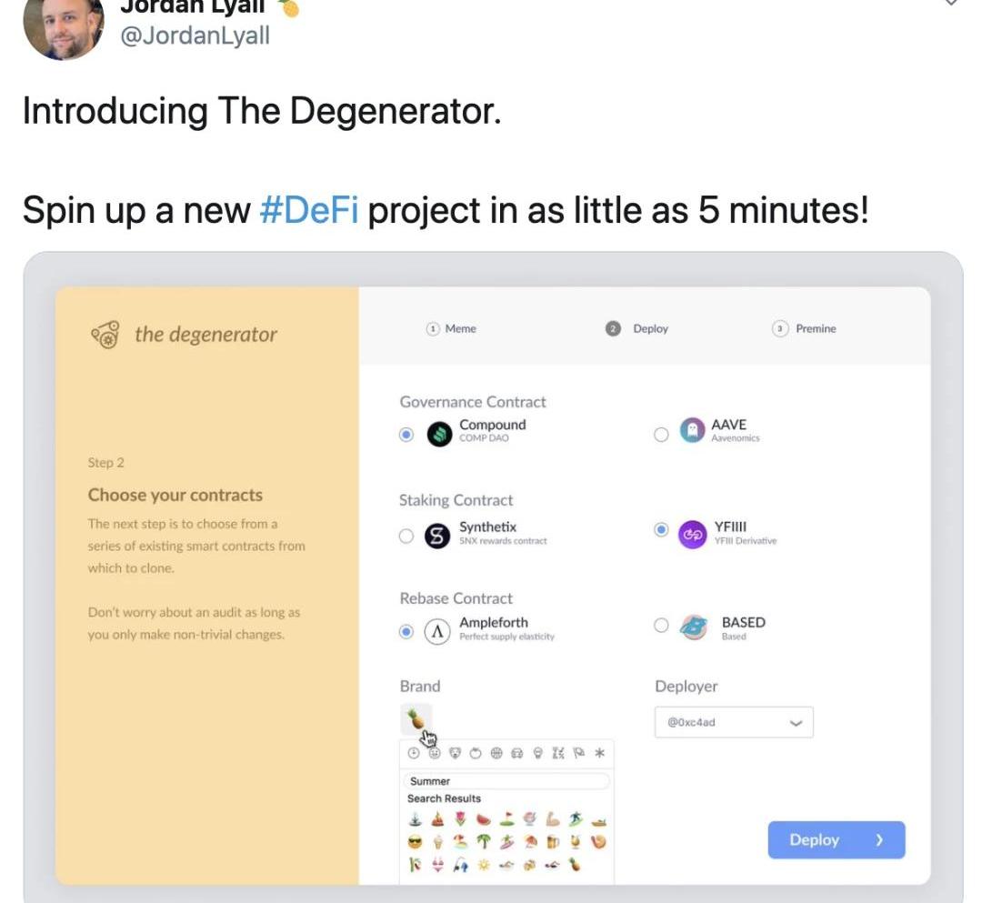 或許還有用戶記得,此前,幣安上線IEO項目Sand時,市場也掀起過非常短暫的NFT熱,導致NFT板塊的一眾幣種漲幅喜人。仔細觀察近一周所謂的NFT熱,不難發現熱度并不在于Mana、Enjin這類早期項目中,而是集中在MEME這類所謂的DeFi+NFT模式項目中。其中,早在MEME之前,Aave社區中就出現了DeFi+NFT模式的項目Aavegotchi。用戶將資產存入Aave借貸池中,可以獲得aToken憑證,然后抵押aToken憑證,來生成Aavegotchi。而Aavegotchi的價值由抵押資產數量、特質和稀缺性決定。通常NFT類的東西,越是稀缺,則價格將越高。只是Aavegotchi僅吸引了很小一部分的熱度。真正推動這波熱度的項目是MEME。不過,誰能想到,MEME竟是起源于一條具有諷刺意味的推特呢?當時,流動性挖礦正火熱,各類仿盤層出不窮。于是,Consensys的開發者JordanLyall在推特中嘲諷這些仿盤項目:“向大家介紹Degenerator,5分鐘內就能啟動一個DeFi項目。”Jordan還給它命名為MEME。