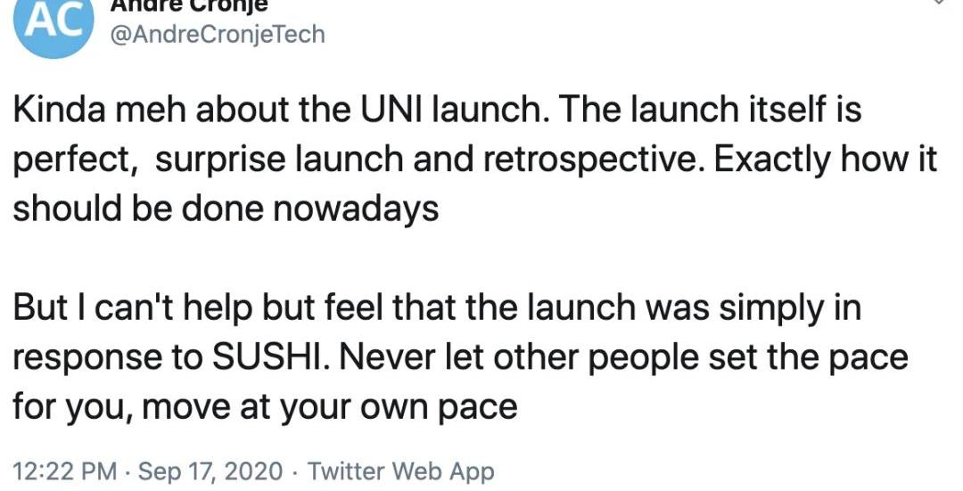 Andre之所以會這么認為,是因為在此之前,Uniswap披露的各種信息都指向他們將在推出V3版本的時候發幣,現在發幣似乎有悖于他們的計劃。但不管是提前發幣也好,還是回應Sushi也好,總之目前UNI已經出現,并由此引發了CeFi和DeFi兩個領域的震動。對于用戶而言,Uniswap發幣特別是巨額空投給大家上了生動的一課:我們都需要積極參與新事物。