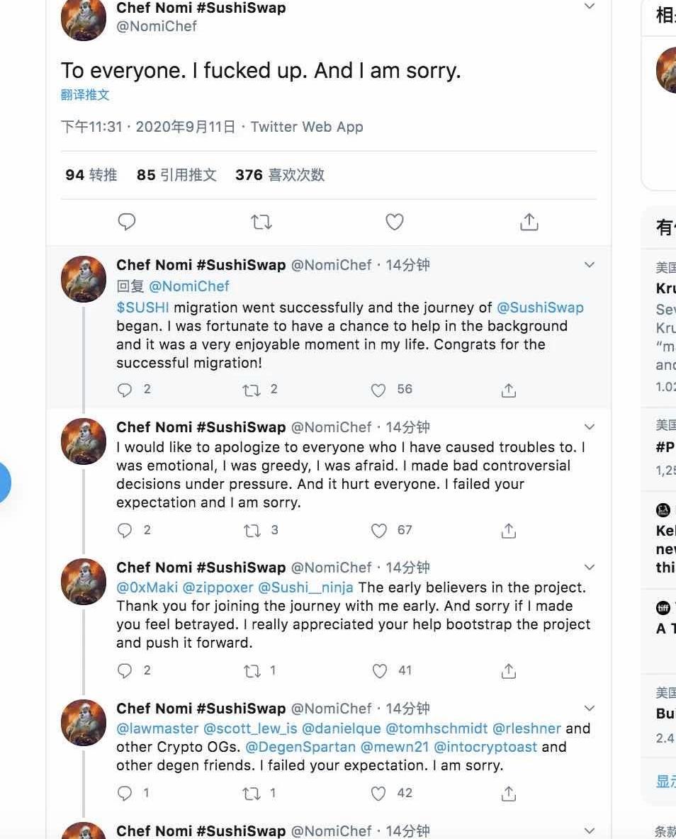 一周前,ChefNomi將分配給SushiSwap項目開發的部分壽司代幣兌換成了以太幣,這一行為引發了市場的憤怒,并一度將SushiSwap項目推向了懸崖邊。在此之后,ChefNomi宣布將SushiSwap項目的控制權移交給了FTX首席執行官SamBankman-Fried的手中。而在本周早些時候,SushiSwap在SamBankman-Fried的帶領下成功地完成了遷移,并從Uniswap帶走了超過8億美元的流動性資金。令人意想不到的是,此前已跑路的匿名創始人ChefNomi選擇重回SushiSwap社區,并歸還了此前砸盤獲得的所有ETH,他還致歉稱:“我要向所有因我而惹上麻煩的人道歉,我當時情緒太過激動,太貪婪,也很害怕。我在壓力下做出了錯誤的、有爭議的決定,而它傷害了每個人。我辜負了你們的期望,我很抱歉。”隨后,Nomi公布了返還以太幣的交易情況,他還寫道:“我已將價值1400萬美元的ETH全部退還回了SushiSwap財政部。我會讓社區來決定,我作為SushiSwap的創造者應該得到多少。以任何貨幣的形式,并且會有你們任何想要的鎖定期安排。我將繼續參與SushiSwap的討論和技術實現,但我不會有任何控制權,我也不會成為治理的一部分。我希望SushiSwap能夠繼續發展。別讓我的錯誤阻止它成為一個100%社區管理的AMMDEX。SushiSwap的成功將為更多的社區經營項目開創先例。”你怎么看?