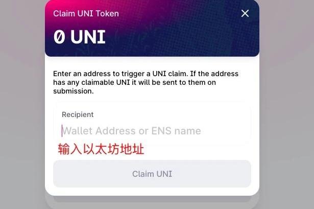 4.1如果符合領空投條件,則系統提示“ClaimUNIToken400UNI”。隨后即可輸入收UNI的以太坊地址。打幣后的界面如下。