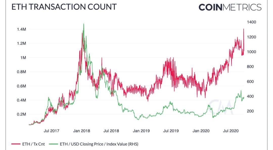 來源:幣元網CoinMetrics網絡數據圖表9月17日,由于用戶向Uniswap合約發送交易以認領和交易UNI代幣,發送至Ethereum智能合約的交易量也創下了915.56K的歷史新高。自7月以來,隨著去中心化金融主導Ethereum活動,發送至合約的交易量激增。這標志著隨著DeFi的不斷發展,Ethereum越來越多地被用作智能合約平臺。下圖顯示了每天發送至合約與非合約地址的交易量,使用7天移動均線。