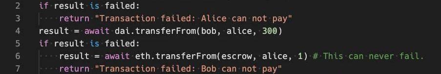 但現在我需要處理錯誤。如果第一次交易失敗,我們可停止交易。如果第二次交易失敗,就需要將1個ETH退給Alice。問題是,這時Bob可能已經把那1個ETH花了。解決這個問題的一個方式就是托管。