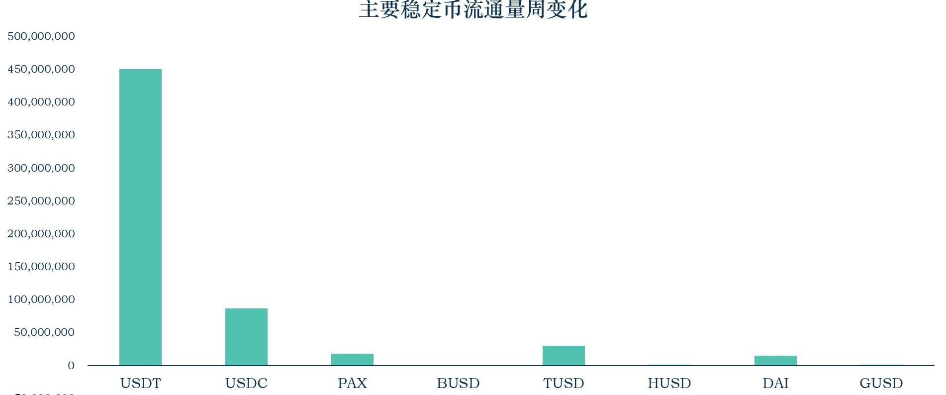 來源:MYKEY,CoinMetrics過去一周,Tether在Tron上增發了兩次,共4.5億USDT。USDC、PAX、TUSD、HUSD、DAI、GUSD的流通量分別增加8648萬、1797萬、3001萬、124萬、1506萬、128萬,BUSD的流通量減少98萬。持幣地址數