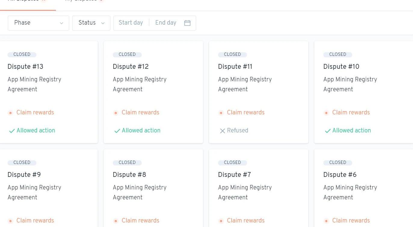 AragonCourt是Aragon提供的另一個重要服務,即Aragon法院。AragonCourt提供仲裁服務,如果社區成員對某個事項存在爭議,可以通過抵押一定數量的Aragon代幣ANT發起仲裁,同時也需要支付仲裁費用。在這里引出了ANT代幣的一個重要用途,即通過抵押ANT生成ANJ成為仲裁陪審員,仲裁陪審員可以通仲裁糾紛獲得收益。想要成為陪審員至少需要抵押10000枚ANT代幣,抵押的ANT越多,則被選中仲裁案件的幾率越大,一個糾紛一般只會選擇3位陪審員,如果對仲裁結果有異議發起上訴,才有可能讓更多陪審員參與其中。從下圖可以看出目前一共抵押了425萬枚ANT代幣,一共有261位仲裁陪審員。