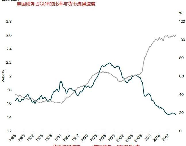 真實GDP增長情況與真實工資增長對比在過去半個世紀,寬松的財政政策促使資本市場舉債購買資產,而在2008年的全球性金融危機中,其中的一部分債務遭到強制清償。金融危機階段的量化寬松政策旨在緩解螺旋式上升的債務現狀,并挽救經濟于水火之中,然而QE的結果卻是火上澆油。另一方面,寬松的貨幣政策導致大量資金流入金融資產領域,而不是如預期的那樣流入傳統經濟或者普通大眾,進而加劇股市和經濟的脫節。如圖2所示,美國債務占GDP的比率自2008年以來幾乎翻了一番,而M2貨幣供給的速度,即貨幣流通速度,卻隨著新發行貨幣進入金融領域而不是實體經濟而快速下降。注:MainStreet即普通的美國投資者、小型獨立企業和投資機構、或實體經濟,與WallStreet即華爾街為代表的高凈值投資者、大型跨國公司相反。