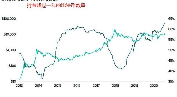 同樣值得關注的是,比特幣鏈上數據顯示持有超過一年的比特幣數量創歷史新高。這說明,當前投資者看好比特幣未來走勢。雖然這是衡量比特幣供應情況的指標,但這表明市場對對比特幣價值儲存手段的需求——盡管比特幣波動性很大,但投資者們似乎對持有比特幣更感興趣,而不是交易。