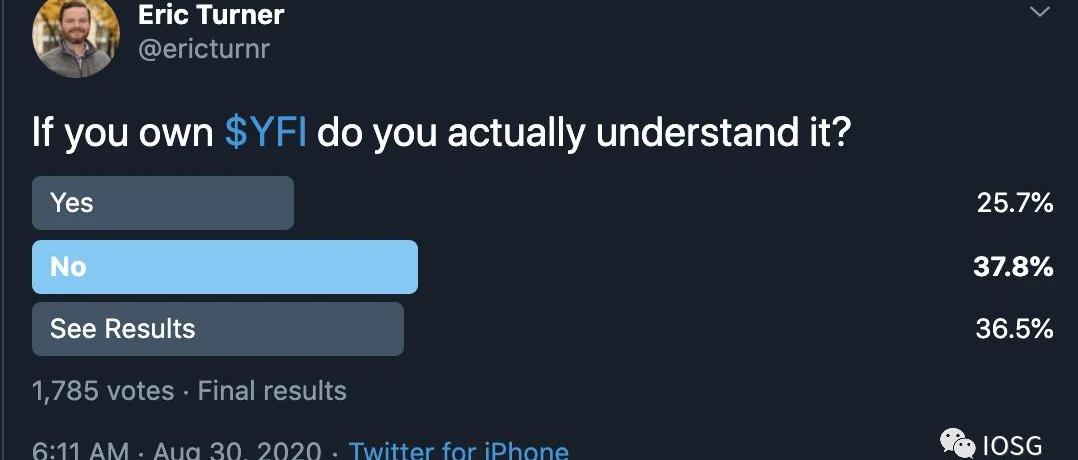 Source:EricTurner-Twitter到底什么是YFI#43期周報中我們提到過“三無項目”,三無項目指的是沒有投資人,沒有預挖,代幣沒有經濟價值的項目。YFI就符合這樣的一個定義。最近企圖挑戰Uniswap的匿名項目Sushi隨著創始人拋售社區代幣而信用崩塌,但是原生區塊鏈社區化的趨勢不可逆轉。YFI是Yearn.Finance的治理型代幣。Yearn.Finance成立于2020年1月,在2020年7月16日之前,YearnFinance只是一個簡單的收益聚合器,用途就是幫助用戶來優化他們在Defi上的收益。當時Yearn的鎖倉量大約在8百萬美元之間,隨著2020年6月Compound開啟了Defi流動性挖礦的熱潮,許多項目也加入到了流動性挖礦的行業。。在2020年7月17日,Yearn.Finance的創始人AndreCronje宣布將協議的治理權下方給其社區成員,并與Curve和Balancer合作。YFI還在創新什么玩法?1、保險再創新:YFI創始人AndreCronje近期宣布,即將推出去中心化的保險類服務原型yinsure.finance,首批支持項目為Aave、Balancer、Compound、Curve、Synthetix,以及YFI。該產品將包含三個核心部分:承保金庫、投保金庫和索賠治理。承保金庫的保險服務是由流動性提供方提供的,但是可以獲得相關的費用作為收入。首個上線的承保金庫是USDC,首個提供的投保金庫是yVault中的yUSD資產。保險單代幣化意味著可以由一般市場進行風險調整。這也意味著分銷商可以在二級市場上購買和轉售,同時允許將來有其他基于保險的衍生產品。2、YETH機槍池:vault最新推出的yETH的產品,年化收益90%左右,上線僅4個小時,鎖倉突破4萬ETH。因此我們認為,Vault解決了用戶耕種所需要的教育成本,同時也解決了頻繁小額交易高交易手續費的問題。3、公平啟動捐贈:最近海外社區基金推出「公平啟動基金」創新,Andre在三天之后也開創一種突破人們想象力的方式,讓創始人可以從yearn借款,來進行自己項目的公平啟動。是什么成就了YFI的火熱和其他DeFi項目不同,Yearn.Finance最大的區別在于該項目在代幣發行前沒有進行私募,沒有進行預挖,沒有給團隊和顧問的代幣分配,所以也被社區成為“三無項目”(沒有投資人,沒有預挖,沒有經濟價值)。這樣的代幣經濟模型,打破了區塊鏈項目的傳統代幣分發機制,映射了區塊鏈社區一直倡導的社區至上及去中心化的觀點。截止2020年9月3日,Yearn.Finance鎖倉排名DeFi第5名,鎖倉量達到892.5M,超越Compound(709M)。正如我們在先前的流動性挖礦報告中所寫的一樣,流動性挖礦一開始的“手動耕種“需要用戶手動將自己的資金部署到不同的協議中,這就要求用戶對不同DeFi項目的有深入的了解。我們看到越來越多的項目開展了自己的流動性挖礦,這使得收益耕種變得越來越復雜。再加上以太坊的擁堵,交易手續費的大幅增加,這使得很多散戶根本無法獲益。在一開始yearn的想法只是簡單想幫助用戶找到最好收益的defi平臺,每當用戶將自己的資金存入/取出yearn的池子中,yearn就會尋找是否有更好的收益機會,如果有的更好的收益機會yearn就會對流動性池進行重新調整。