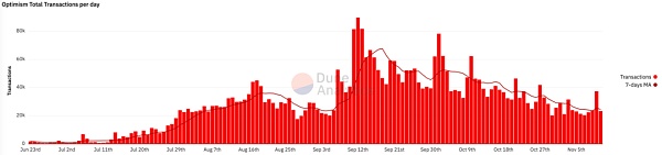 Optimism日交易從今年6月到10月基本一致保持著較高增長,最高每日交易量達到89593筆,從10月開始有所下跌,11月至今日交易量維持在2萬筆以上。