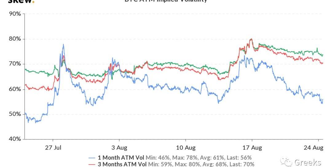 BTC歷史波動率10d37%30d58%90d48%1Y80%期權持倉量16億美元,期權成交量1.36億美元,比特幣橫盤上漲至11800美元。比特幣反彈帶動成交量上升,超過了昨天的兩倍。各標準化期限隱含波動率:今日:1m56%,3m70%,6m74%8/23:1m57%,3m71%,6m74%IV穩定,目前一天幾百美元的行情很難對IV產生沖擊。但是末日期權的IV參考意義已經不大,末日期權的pinrisk開始顯現。