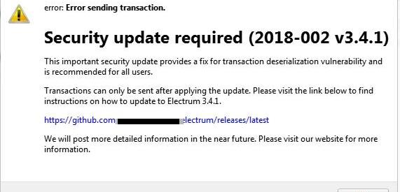 該用戶使用的是Electrum比特幣錢包,上次使用是在2017年。此后Electrum已經發布了安全更新,但該用戶一直沒有安裝。用戶在使用Electrum進行交易時,錢包會向服務器廣播一筆交易,如果這筆交易出現了問題,服務器將返回錯誤信息并以彈窗的形式展現給用戶。3.3.2版本之前的Electrum錢包不會對服務器返回的錯誤信息進行驗證,甚至還會對返回的信息進行html渲染。值得一提的是,任何人都可以去搭建一個Electrum節點服務器。如果一個用戶連接到了攻擊者的服務器并發起了一筆交易,服務器可以返回任何設計好的錯誤信息。比如返回一個讓用戶去更新Electrum錢包的錯誤信息,如下圖所示。