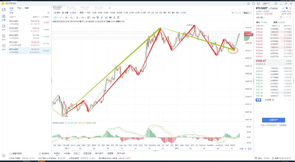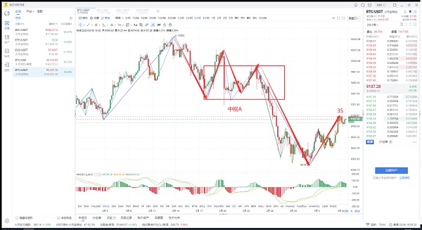 BTC4小時三賣高點,遇到30分鐘三買反彈,最安全的操作,等30分鐘三買反彈結束后,做4小時三賣的空單。