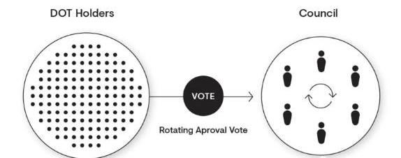 要詳細了解上述公式的來源,請閱讀民主板塊。例:假設:-總量僅1,500DOT-公開提案John-500DOTPeter-100DOTLilly-150DOTJJ-150DOTKen-600DOTJohn:投`贊成`且鎖定DOT4周=>500*1=500票Peter:投`贊成`且鎖定DOT4周=>100*1=100票JJ:投`反對`且鎖定DOT16周=>150*3=450票贊成=600反對=450投票率=750總選票=1500