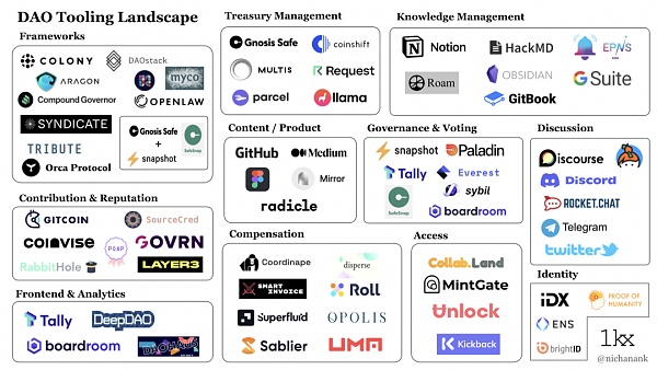 事實上,DAO的含義和治理理解起來也并不是那么簡單。DAO不僅僅指的是一個聊天的Discord頻道,也不是一個簡單的分布式社區。它需要借助一些工具或核心組件來進行更高效的治理,包括資金管理、治理框架、聊天社區、投票工具、聚合器等方面,另外通常還需要有社區治理代幣,通常是同質化代幣(FT)。