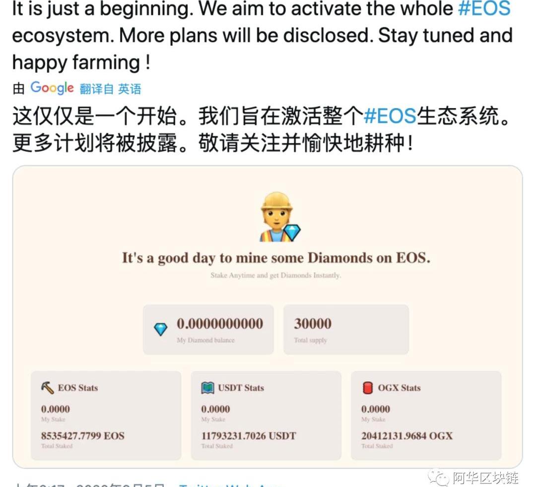 不得不說"鉆石"這個名字起的真不錯,如果該項目沒出事,EOS社區都要感謝"鉆石"的出現。相信大家也已經感受到該項目的火爆程度了,許多非EOS群都在聊"鉆石"了。我們先看下鉆石項目簡介。鉆石項目概況:鉆石項目沒有創始人、沒有投資人、沒有預挖、沒有增發、全民平等。希望能推動EOSDeFi社區的大發展。代幣名稱:DMD代幣總量:30000枚合約地址:eosdmdtokens代幣分配:鉆石礦池V1:USDT:3000枚EOS:2500枚OGX:2500枚鉆石礦池V2:合作方申請項目12000枚DMD/EOSLP:5000枚鉆石礦池V3:5000預留礦池,將由社區投票決定電報社區:https://t.me/dmdfinance_cn每個鉆石礦池挖礦時間為1周在"鉆石"項目現階段,玩法還比較簡單,目前是存入EOS、USDT或OGX就可以挖礦了,也就是單幣存入就可以,可以看到除了EOS和USDT之外,OGX也加入了礦池中,這也是昨天OGX大漲的主要原因。許多人覺得這個項目加入了OGX,而且TokenPocket錢包第一個上線,所以推測是TokenPocket做的,或者至少是和TP是有關系的,我第一時間咨詢了下TP的相關人員,TP人員回復說"鉆石"項目和他們沒有關系,他們也只是在錢包上展示而已。不管怎樣,還是希望這個項目不要跑路。