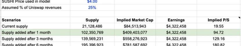 不過到目前為止,還沒有人基于價格銷售比來做真正的交易,但這會是一個起點。同時,DeFi代幣通常對通貨膨脹有高度敏感性,我們設計了一個簡單模型,其中假定SUSHI代幣價格為4美元,以及Sushiswap能夠獲得Uniswap年收入的百分比是25%,一個月、三個月、六個月和十二個月的結果分別如下: