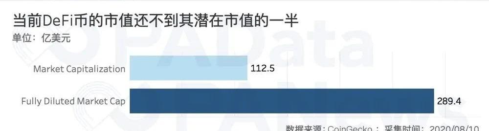 其次,COMP、MKR、SNX和LEND的市值也進入了DeFi領域的前五,其中COMP和MKR的市值都超過了5億美元,各約占整個市場的4.91%和4.89%。以上市值是根據已流通的代幣數量來測算的,如果考慮到還沒有被挖出來的代幣數量,那么按照當前的幣價來看,DeFi市場被稀釋后的市值規模可以達到289.4美元,當前市值大約是稀釋后市值的38.87%,這意味籠統來看當前通過流動性挖礦挖出來的代幣數量已經達到了計劃流通的38.87%。不到兩個月,流動性挖礦的進程已經超過了三分之一。