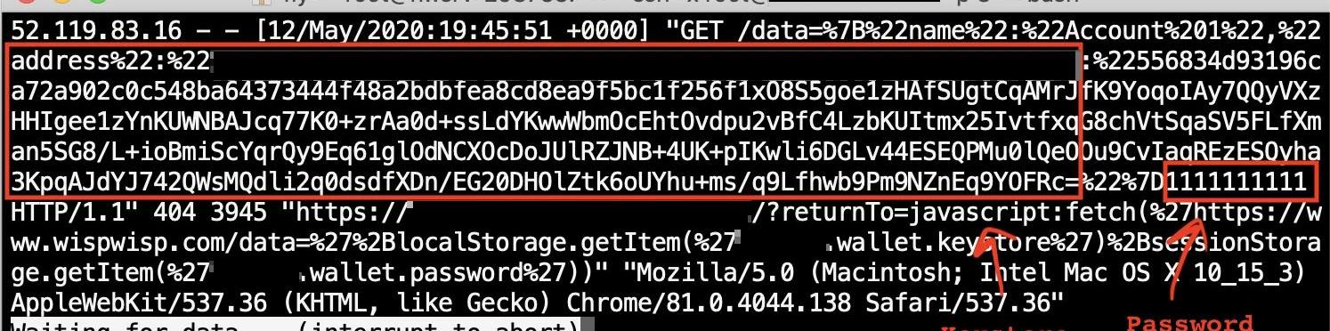 利用DOMXSS那如何利用所發現的DOMXSS漏洞來竊取本地存儲中的Keystore和Password呢?在下面的這個URL中,它可以讀取Keystore和Password的內容,并將其發送到黑客的服務器。在黑客的服務器日志中,可以直接看到Keystore內容和Password。一旦掌握了這些信息,就相當于控制了用戶的賬戶,可以登錄到他們的錢包并將錢轉出。