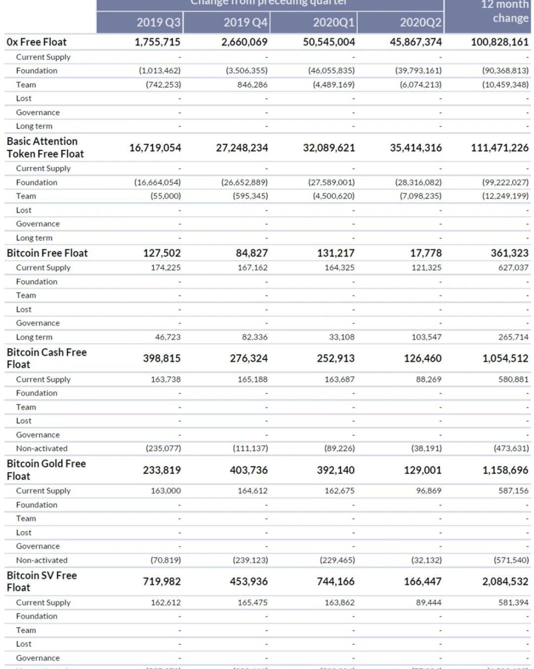 0x(ZRX)在2020年上半年,基金會和團隊ZRX地址交易量一直高于歷史觀察值。僅在第二季度,基金會地址凈供應減少了3980萬ZRX,團隊地址凈供應減少了610萬ZRX。基金會和團隊ZRX交易的凈影響是增加了4590萬ZRX的自由浮動供應,比去年同季度多發行了3580萬ZRX。BaseAttentionToken整個第二季度,比特幣自由浮動供應量增加1.8萬至1432萬枚。這代表著自由浮動供應量相對于前幾個季度有較小的增長,這主要是由于比特幣減半導致的發行計劃減少,以及屬于長期持有者的受限BTC大幅增加。本季度,長期持有者擁有的比特幣大幅增加,新增近10.3萬BTC,比上一季度增加300%。Bitcoincash比特幣SV在比特幣現金之后不久就經歷了減半,因此本季度的新發行率與之相似,通過挖礦產生了8.9萬新BSV。然而,與BCH和BTG類似,BSV經歷了分叉后首次激活的原生單位明顯減少,只有7.7萬BSV新激活并進入自由浮動,低于上一季度的58萬。Cardano和50萬。本季度進入自由浮動供應的300萬資產中,有很大一部分最終進入了Binance地址。crypto.comCoin(CRO)2020年第二季度,CRO的自由浮動供應量增加了59億,與前三個季度自由浮動總量只增加了240億相比,有了明顯的增長。在本季度,有12億CRO從基金會控制的地址發送到團隊控制的地址,另有59億CRO從基金會控制的地址發送到Huobi、Bittrex和OKEx。DASH(DASH)DASH的發行率每210240塊調整一次,二季度也是如此,從約6.6%下降到4月底的約6.0%。這導致本季度礦業新增供應量降至16.2萬,較去年季度均值下降1萬。二季度DASH戰略長期持有者持有的限制性供應量又增加了2萬,與上季度增幅基本一致。Decred。這幾乎完全歸功于每一個區塊推出的新挖礦供應,第二季度共挖出124萬ETH。此外,Ethereum基金會通過本季度發行了1.1萬ETH,從而使第二季度的自由浮動總量增加到12.5萬。在Q3期間,Ethereum將滿5歲,這將首次導致識別任何自創世區塊或不久之后沒有交易的長期持有者,可能會對Ethereum的自由浮動供應產生比以前更多的影響。EthereumClassic(ETC)EthereumClassic進行了升級,3月份期間區塊獎勵從4ETC下降20%,降至3.2ETC/區塊。這種新的通脹時間表第一次通過一整個季度的數據顯現出來,導致挖礦的新增供應量從季度平均230萬下降到190萬。進一步增加了自由浮動供應量,自Ethereum/EthereumClassic分叉后一直未動的61KETC在第二季度開始活躍。FTXToken(FTT)FTX繼續每周進行FTT鏈外銷毀,將FTT代幣從賬面上刪除。整個第二季度,銷毀總量接近150萬枚,使創世以來銷毀的FTT總量幾乎達到近500萬枚。在第二季度,FTX公司識別地址向FTX交易所發送了50萬個FTT,比之前三個季度平均約200萬個FTT大幅減少。公司識別地址活動和銷毀行為加在一起,導致2020年第二季度自由浮動凈增加3.5M。HuobiToken(HT)HuobiToken的自由浮動供應在2020年第二季度減少了87萬。其中,HuobiGlobal在Q2期間將115萬HT從交換地址發送到0x0000000000000000000000000000000000000000燃燒地址,使得這些代幣丟失,無法使用。這一代幣鏈上銷毀速度與前幾個季度一致,不包括2020年第一季度來自平臺運營和投資者保護基金的一次性銷毀1470萬HT。HuobiGlobal在第二季度2期間通過從公司確定的交易資金中增加了290萬HT到自由浮動供應中。Litecoin(LTC)Litecoin的季度自由浮動供應量增幅是過去一年中最低的,整個第二季度只增加了40萬LTC。雖然新開采的供應量與前幾個季度一致(66.8萬),但在錢包中持有的LTC數量顯著增加,這些LTC的年齡為5年,但沒有表現出活動性。長期持有者類別(即受自由流通供應限制)新增的26.8萬張長期持有者的LTC,是之前三個季度平均12.5萬張LTC的兩倍以上。MakerDAO(MKR)到2020年第二季度,MKR的自由浮動供應量下降了226萬,這主要是由于參與'Maker。治理合約"凈增加了366萬MKR。參與網絡治理的MKR持有者是通過在合約中押注原生單位而主動進行的,沒有任何直接的經濟激勵,因此被認為限制了市場的供應。MakerDAO基金會控制地址的交易導致本季度凈流出144萬MKR。第二季度有392個MKR被銷毀并從當前供應中移除,這與3月閃崩導致大規模清算后第一季度的6K鑄幣相比有很大變化。NEO(NEO)2020年第二季度NEO自由浮動供應量增加了46.2萬,這完全可以歸功于NEO從基金會自有地址中的移動。這一基金會錢包移動速度與之前三個季度平均41.7萬的NEO一致。StellarLumens(XLM)截至2020年第二季度,StellarLumens自由浮動供應增加了1.95億XLM,幾乎完全是XLM從基金會控制的地址轉移到更多的流動性地址的結果,包括大量轉移到Coinbase和Kraken。Tezos(XTZ)由于Baking過程的影響,截止到第二季度,Tezos當前供應量增加了151萬。其中,380萬是由Tezos基金會地址烘焙的,導致整個季度自由浮動供應量增加了1140萬。XRP(XRP)截至2020年第二季度,XRP自由浮動供應增加了13.5億,略高于上一季度進入自由浮動供應的11.2億。本季度為市場提供額外流動性的最大供應商是Ripple基金會,該基金會從基金會確定的受控地址發行了111億個代幣。本季度離開創始團隊成員控制的地址的XRP數量也有所增加,從之前三個季度的平均數量1.64億增加到3.07億XRP。此外,還有510萬XRP的地址在5年以上沒有顯示活動后被歸類為長期持有者。詳細的自由浮動供應信息: