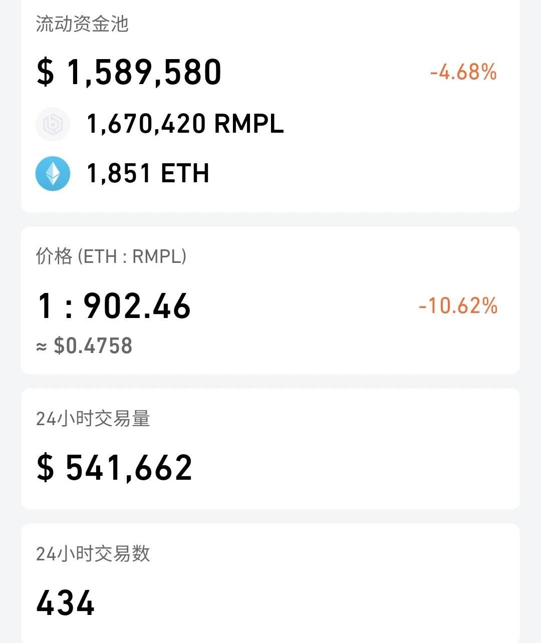 RMPL項目資金池狀況RMPL目前的資金池在Uniswap上排名第35名,達到了AMPL的1/20左右,算是較大的項目。不過RMPL資金池變化特別大,和AMPL的關聯性很強。只要AMPL出現暴漲,RMPL的資金池就會在短時間內減小。這也可以看出,仿盤畢竟是仿盤,只要AMPL價格穩定在1美元以上,用戶還是會選擇AMPL。