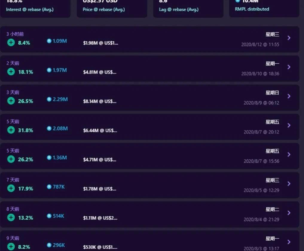 為什么AMPL系會獲得那么多玩家的關注呢?主要原因有四點:1.模式簡單,門檻低,賺錢效應強。AMPL系玩法簡單,門檻又很低,可以直接在Uniswap上轉換,放在以太坊錢包里,就可以自動得到增發的幣。只要學會如何利用Uniswap進行換幣,就可以很快速地進行這類型的項目操作,所以短時間內能夠吸引大量的用戶參與進來。早期參與的投資者也就不斷的獲得增發的代幣,只要幣價穩定,這些增發的代幣就是收益,賺錢效應又能吸引用戶參與進來。2.錯過AMPL早期紅利的的投資者,會選擇參與到仿盤中。很多投資者錯過了AMPL早期的紅利,又不愿意在AMPL高價或者處于減幣的階段下參與進去,就會去尋找類似的有賺錢效應的仿盤,選擇在第一時間沖進場賺取早期的紅利。像RUZE和RMPL早期進場的投資者都有幾倍的收益,特別是RMPL除了代幣增發之外,代幣的價格也曾在原來價格的基礎上漲了2-3倍。這樣高幅度的漲幅,也會吸引投資者參與進來。3.AMPL陷入死亡螺旋,獲利玩家尋找新盤子玩。AMPL在Uniswap的資金池高達7萬個ETH,排在了Uniswap上的第一名,但是因為目前項目進入了通縮狀態,大資金出逃,短短幾天內就有上萬個ETH出逃。很多玩家為了減少損失不得不去尋找類似的仿盤參與進去,從中獲利。也有在AMPL獲利者會去尋找類似的項目參與進去,這些仿盤就很容易成為這些投機者的目標。4.持續穩定的分幣吸引用戶入場。
