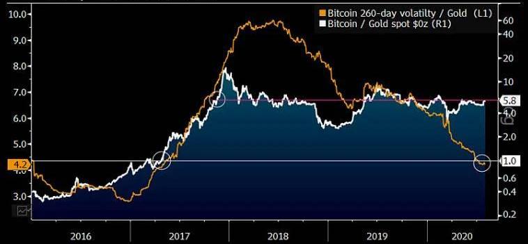 比特幣1萬美元vs納斯達克指數1萬點:加密貨幣占上風:比特幣比納斯達克指數更有可能維持更高的水平,因為需求增加而供應減少,與納斯達克綜合指數相比,波動性降低。央行的流動性和財政刺激可能會限制股市下跌,但這是準貨幣比特幣和黃金重新啟動牛市的主要催化劑。比特幣對納斯達克指數的比率已經達到1:1:比特幣與納斯達克指數之間的波動率達到有史以來最低水平,這表明比特幣已經成熟,將在近三年內從1:1的價格與指數比率上升。下圖顯示了比特幣260天的波動率與納斯達克綜合指數創下新低的比率。2017年比特幣價格與納斯達克指數持平;從那以后,比特幣的波動性平均提高了5倍。現在這個差距只有1.7倍,是自2011年以來最低的。