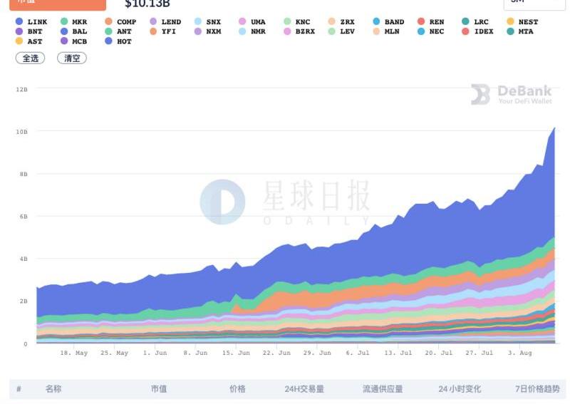 數據:DeFi項目總市值突破100億美元,LINK占比過半DeBank數據顯示,當前DeFi項目總市值突破100億美元,約101.3億美元。其中,LINK市值超過51.36億美元,占總體份額50.71%;MKR市值超過5.26億美元,占總體份額5.2%;COMP市值超過5.19億美元,占總體份額5.13%。注:"DeFi項目市值"是衡量一個DeFi項目估值的指標。計算公式:DeFi項目市值=DeFi項目代幣價格x代幣流通供應量。