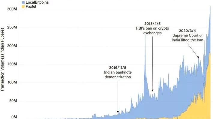 2、阿根廷、巴西、印度比特幣交易量創下新高據Decrypt8月11日消息,阿根廷和巴西的每周比特幣交易量較過去兩個月分別增加169%和20%,均創下新高。另一方面,據Paxful和LocalBitcoins交易量數據,印度的比特幣點對點交易量在7月份也達到了歷史最高水平,達到1370萬美元。目前,阿根廷、巴西兩國都面臨嚴重經濟危機,新冠病全球流行則加劇了這一危機。在嚴格的貨幣管制下,法幣持有者很難找到資產避難所,作為南美第二大經濟體,阿根廷的經濟今年來已失控。8月初,阿根廷政府與本國主要債權人達成了650億美元的債務協議,使本國債務大幅減少,但這必然會對阿根廷國內外金融市場產生深遠影響。在此背景下,阿根廷人正在大幅買入比特幣。印度在Paxful和LocalBitcoins兩個點對點交易平臺的交易數據如下所示,盡管最近印度正在考慮通過禁止加密貨幣的法律,但這絲毫未影響到投資者的熱情。
