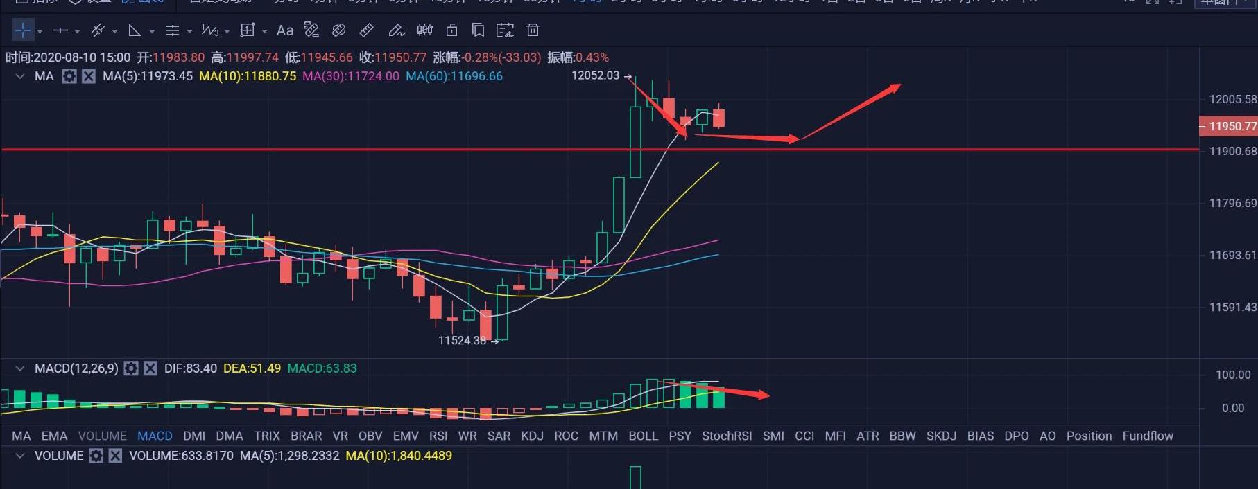 可以看到上午的拉盤也沖破了近一周都未突破的高點11900美元,當前還在該位置上方運行,但今天畢竟還沒有結束,剩下的時間也要繼續接受考驗。今天也不用12000美元,只要站穩11900美元,在接下來幾天站穩12000美元也是輕而易舉。小時線上還是有震蕩回調的需求,MACD綠柱呈現縮短走勢,K線回調的幅度不夠深,時間也不夠長。如果在該位置持續的時間較長還是跌不下去的話,后續資金自然會介入再次拉盤。