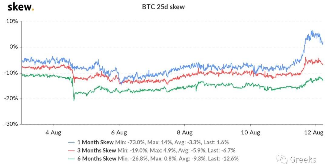 偏度:今日:1m-0.9%,3m+6.3%,6m+12.8%8/11:1m+5.4%,3m+10.5%,6m+15.3%短期skew率先回歸,虛值看漲期權偏貴的市場已經接近尾聲。