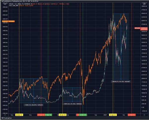 自 2017 年以來,BTC 與標準普爾500 指數的比較(圖 7)。