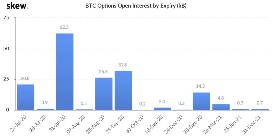 持倉分布如圖所示,本周到期2.08萬BTC名義價值的期權,本次到期實值比重明顯增加,不同于前幾次的賣方大勝。月底31日到期的期權持倉量6.23萬比特幣,次月和季度持倉量不斷上升。
