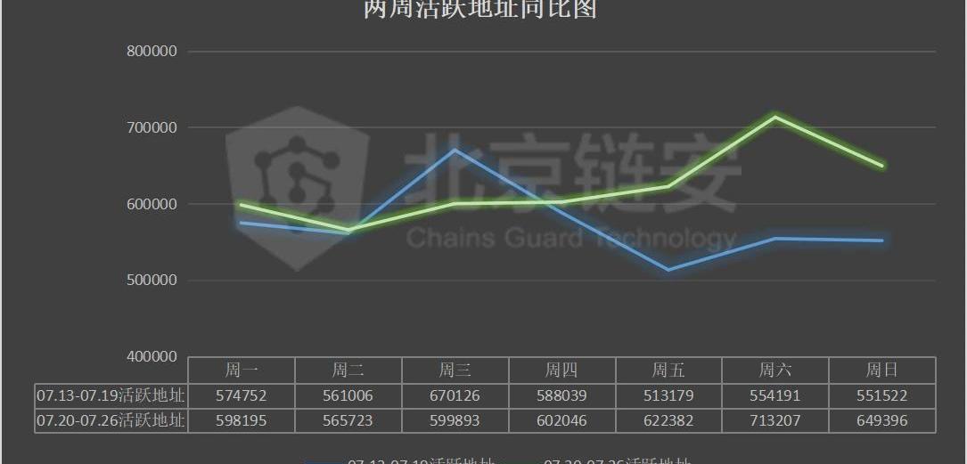 活躍地址數:07.13-07.19:401281507.20-07.26:4350842較之前一周上漲:8.42%詳細數據圖如下: