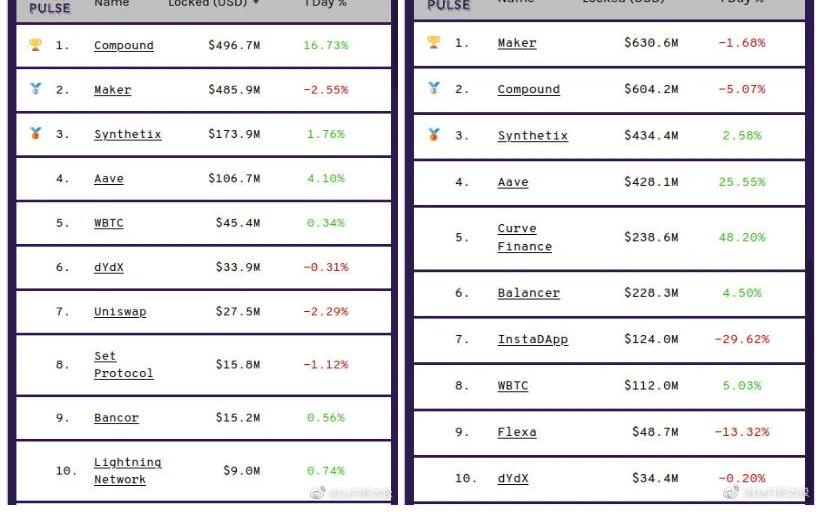 COMP捅破了DeFi的市值天花板,從20億市值開啟了狂暴模式達到了100億。二、流動性挖礦后,DeFi排名的變遷