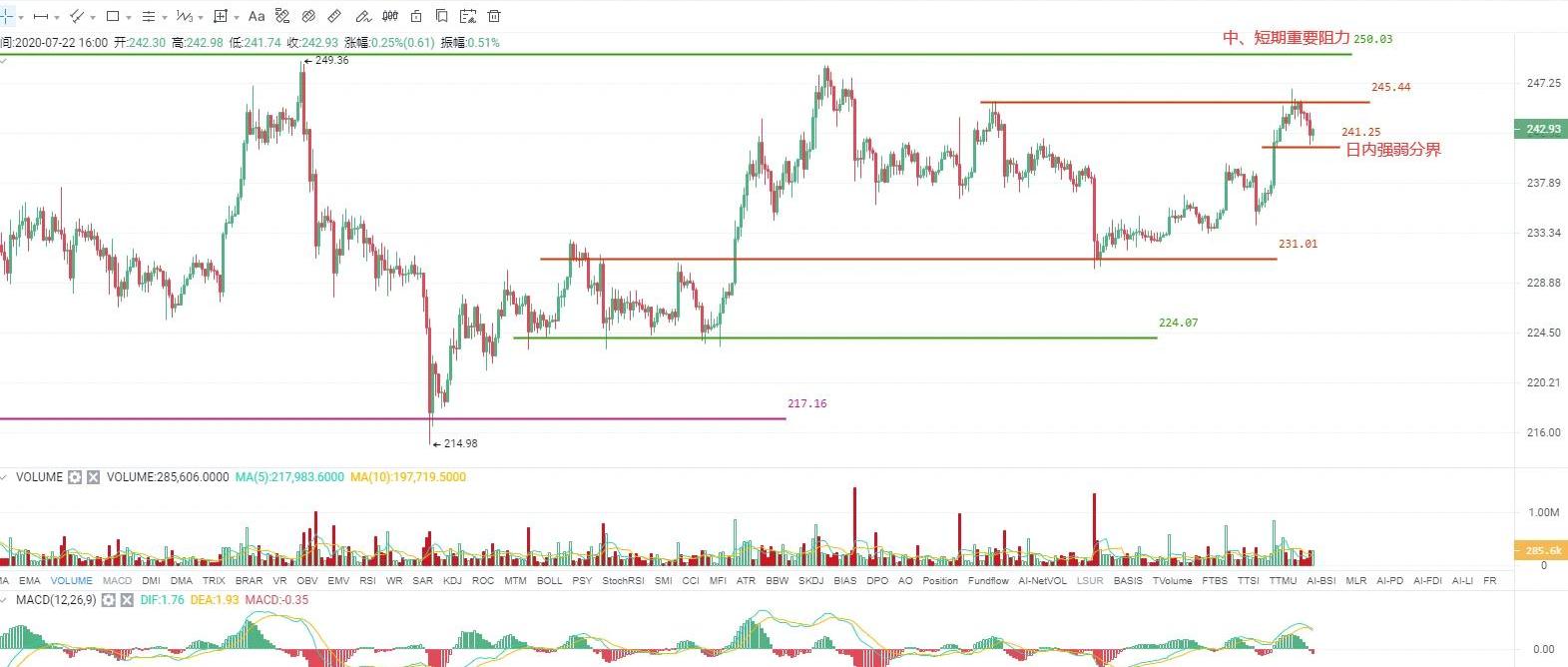 各級別性質:日線-盤整,4小時-盤整,1小時-上漲截圖來自OKEXETH/USDT永續合約2小時圖:目前的客觀走勢及應對策略:ETH的走勢也比較符合昨日晚評預判,幣價在小幅突破245后滯漲回落,目前于241一線暫時止跌。