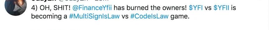 YFII銷毀增發權限證明對此,ETH社區推特大V@0dayZh調侃,YFI和YFII之間的競賽正在變成「MultiSignisLaw」和「CodeisLaw」的競賽,顯然,直接銷毀增發權限更符合DeFi和ETH圈的極客精神。