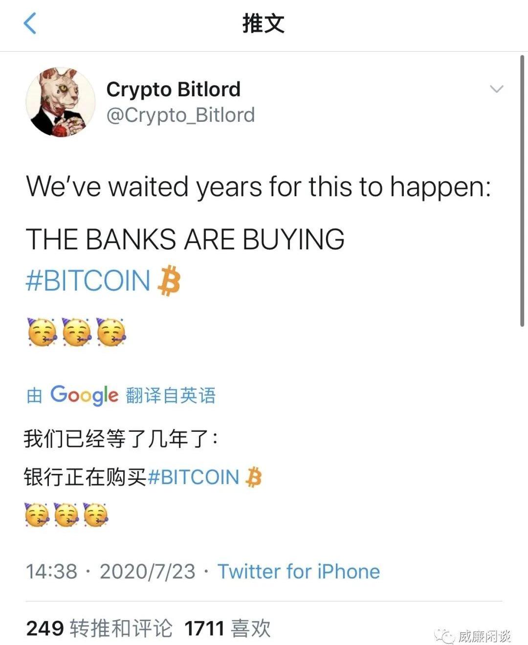 我們還是十分期待一個個“大灰度”的到來。就像這哥們說的一樣:比特幣的市值與傳統銀行業的資金體量相比,簡直就是滄海一粟。而一個灰度就鎖定了比特幣2%左右的流通量,如果銀行業真的進來的話,那就指不定能夠鎖定多大的流通量了。此時此刻,我又想起了沈騰那句臺詞:“再不買就買不著啦!”我們一直期待傳統金融的水能流到幣圈,而真正看到口子在慢慢打開的時候,許多人卻不以為然,這樣是不行的。該學學老外,歡呼起來吧。