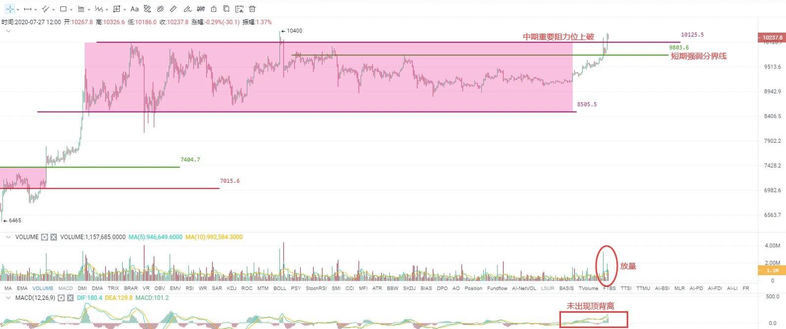 各級別性質:日線-上漲,4小時-盤整,1小時-上漲截圖來自OKEXBTC/USDT永續合約4小時圖:對于行情從兩個角度來說,一個角度是客觀的走勢狀態以及根據客觀走勢所制定的應對策略,另外一個角度是基于經驗的主觀預判。實戰交易主要依據客觀走勢下的應對策略,主觀預測更多的是對未來的發展的一種前瞻或者娛樂,不可以直接用來作為交易策略,主要目的是提早對潛在的風險和機會有心理準備。目前的客觀走勢及應對策略:顯而易見,最近幾天市場漲勢如虹,比特幣時隔近兩個月再次站上10000大關,以太坊更是一舉突破2月份留下的高點,大幅刷新年內新高。雖然說解讀過去都是馬后炮,但是做復盤依然是有必要的,我們要知道上漲背后的邏輯是什么,以便后續再出現此類情形時可以更好的把握行情。對于本輪上漲行情的主要推動因素我認為有以下幾點:1、最具代表性的避險資產-黃金一路扶搖直上,不斷刷新年內高點,并于今天刷新歷史新高,上破2011年9月份大牛市高點。而比特幣一直被相當一部分投資者賦予“數字黃金”的美名,金價的不斷上漲必然會帶動具一批有數字黃金信仰的投資者買入。2、以美聯儲為代表的央行大“放水”已成事實,而放水最直接的影響便是推升資產價格,數字資產當然也不例外。3、在技術層面,幣價于2017年牛市高點向下延伸一條長周期壓力線曾經對價格產生多次強烈壓制,包括自5月初以來所展開的近三個月的盤整也正是受到了這條壓力線的壓制。以往在受到壓制后很快便折返向下,而這次并沒有,而是展開長時間盤整來消化向下的力量,反向推理,這也是一種強勢表現。我們在過往的文章中也曾多次提到一個價位-8500,說它是中線行情的強弱分界線,只要不破該價位,中期走勢都屬于偏多頭格局。好了,復盤的內容就到這里,我說的也不一定對,只做參考。下面我們言歸正傳來看當下,看后市該關注那些位置。從目前的走勢結構來看,中、短期走勢依然明顯處于多頭格局中,暫時上破近三個月以來所形成的盤整區間上沿阻力,并且從4小時、1小時級別看都沒有出現頂背離現象,說明上漲動能未出現明顯減弱。于此同時,在量價配合上也比較健康,上漲時放量明顯,下跌時成交量出現萎縮,上周五晚評也特意強調了這種多頭占優勢的表現。由以上現象來看,幣價后市延續上漲格局的概率要大于轉折向下的概率。不過短期由于絕對漲幅較大,價格又逼近2月份高點,短期有調整需求。不過只要調整不破9800,都可以視作良性調整,無需過度解讀。換言之,只要調整行情出現,且能在9800上方出現止跌信號,依然作為買入機會來對待。主觀預期:預估幣價短線將展開小幅調整但不改上漲趨勢,或將在9850上方出現止跌企穩信號后繼續上漲。本段不作為交易策略參考。阻力與支撐阻力:10500--11000--11500支撐:10000--9800--9450ETH/USDT永續合約