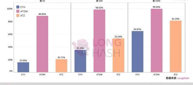 XRP/HKD-2.94%來源/LongHash在2020年,PoS增發系公鏈成為了市場最熱門的話題之一。本文將結合鏈上數據,分析比較三大明星PoS項目ETH2.0、Tezos以及Cosmos,根據當前數據來分析這三大網絡的持幣地址和持幣數量。ETH2.0是ETH將會在今年開始的更新,總共分為四個部分,在將要啟動的0階段,ETH將從PoW挖礦模式轉為PoS挖礦模式,這將意味著ETH的新產出的增發率會從接近10%降低到不足2%,也就意味著低于傳統貨幣的通脹率,ETH的稀缺性將會得到證明。Tezos是一個對標以太坊的高性能底層公鏈,亮點是自我修復功能,XTZ代幣的持有者可以自己抵押代幣做節點,也可以通過將代幣委托給“烘焙師”的方式間接參與治理,并進行技術升級和迭代,最大程度地避免分叉,社區在DeFi與合規金融等方向也有布局。Cosmos是一個提供擴展與互操作性的去中心化網絡,都由Tendermint共識的BFT共識算法構建,TendermintCore和區塊鏈間通信協議形成通用架構,讓各個加密貨幣主鏈實現互操作。隨著幾個明星公鏈的出現,采用PoS共識機制成為新一代公鏈不可阻擋的趨勢,Staking通過質押代幣來參與網絡安全的管理,防止持幣人手中的代幣因通貨膨脹被稀釋。相反,在PoW算法的挖礦領域,礦業背后的商業邏輯是與代幣脫離開的制造業邏輯,更多的是計算機和硬件領域和線下運營。以魚池,比特大陸為代表的幾大廠商在挖礦產業的布局已經頗具規模效應,很難從頭開始布局并超越現有巨頭。當然,PoS也并非完美。有些項目一方面鎖定用戶手上已有的代幣,另一方面拿出一部分增發的代幣作為獎勵給忠實的用戶。乍一看這個模式不錯,但可惜因為后續整體行情不好,部分PoS代幣內在價值不能支撐實際幣價,持有這類項目的用戶經常出現賺了幣虧了錢的情況。再后來市場偏好轉向通縮的經濟模式,一段時間內PoS少有人提及。但在今年上半年,ETH2.0的出現讓這條賽道又煥發了新的光彩,預期在三季度上線的phase0正式確定需要抵押32個ETH進行PoS挖礦,這也就意味著拉低了ETH的預期增發和節點獎勵模式門檻,也將Staking這個模式再次推上了風口浪尖。本文的分析基于AmberdataAPI的數據。1、排名前10、100、1000的地址中有多少代幣在公鏈的世界里不存在明確的身份信息,我們通常將地址作為身份的載體。無論在這個地址背后是一個人或是一群人,它們作為利益共同體在鏈上作出一致性的行為。ETH、Tezos和ATOM都使用賬戶模式,也就是每一個地址即為一個賬戶。截至2020年6月17日,ETH共有101539249個賬戶,并在2018年1月份之后以約每天至少幾萬個的數量增加。但可惜的是這其中大部分都沒有持有代幣。