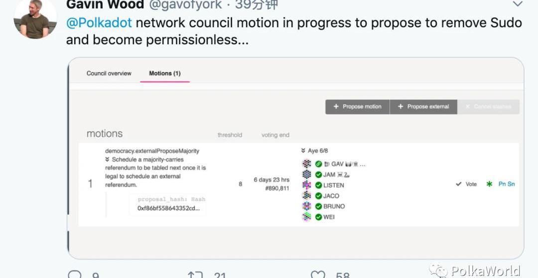 PolkaWorld解讀:截止發文,波卡理事會已經通過已啟動的治理功能發起一個去除sudo模塊的motion提議,目前已經已經得到理事會的全票通過,這意味著,去除sudo這個提議目前已經進入公投階段,Gavin稱其為波卡的第0個公投,DOT持有者有12小時的時間進行投票,考慮到不會有很多人還希望保持sudo的存在,所以這次投票采用簡單多數票的投票類型,一旦通過,將自動執行!屆時波卡將成為由DOT持有者來進行治理的完全的去中心化網絡!