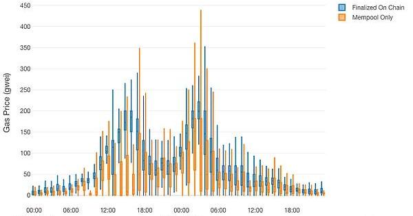 -2020年3月12日至13日每小時的GasPrice箱型圖。每個小時的箱型都劃分了1分位值和3分位值,兩者中間的線表示中值,而箱頂和箱底的線表示最大值和最小值。已忽略掉了異常值-這張圖反映了真實情形嗎?還是說這些出價過低的交易本身就是為了堵塞掉交易池呢?如果真是有意為之,為什么呢?3.Hammerbot交易導致內存池失真