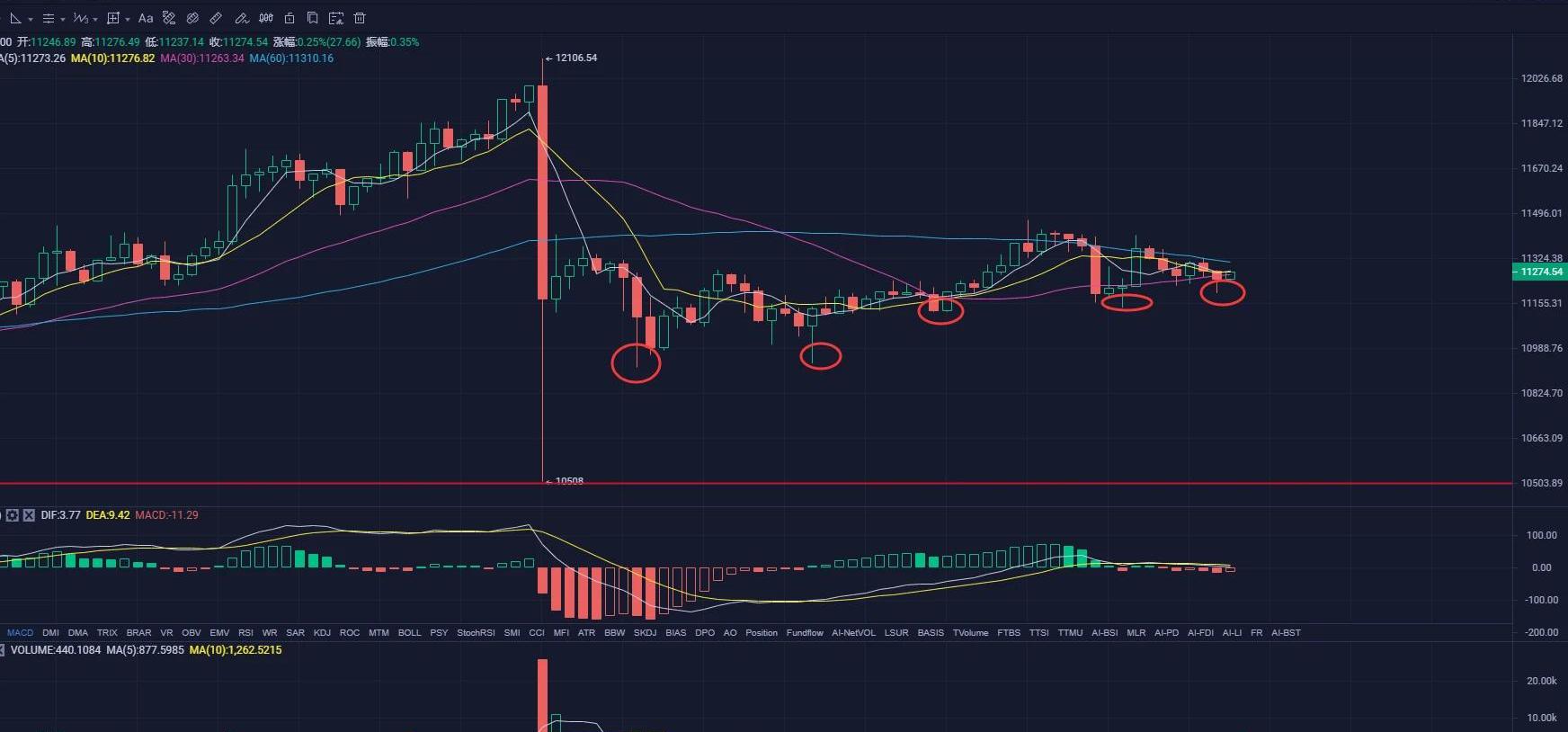 ETH近日的強勢依然有跡可循,原因還是這兩個——DeFi和ETH2.0。DeFi最近的話題并未消減多少,其中重點值得關注的是LINK,一直處于高位震蕩,前日的大跳水也令LIKN短時跌幅異常,但隨后便快速觸底反彈,當天就走出了長下影線的十字星形態。鑒于主流幣在前日損失慘重,部分投資者對主流幣行情的心態一時難以恢復,或許認為當前主流幣被割韭菜后又將進入震蕩中,便開始尋找在這波主流幣上漲之前比較強勢的幣種,LINK便又成為短期內資金流入的突破口,可以說DeFi和LINK是相互成就,互相帶動,一個作為熱點應用,一個作為熱點幣,而這兩個點有動靜時無論如何都會影響終端的ETH,和之前DeFi火爆時ETH后知后覺不同,當下市場大多已經知道ETH前期領漲的原因,所以這次發現DeFi有反應是第一時間便會想到ETH。而ETH近期又有了新的突破,根據以太坊多客戶端測試網絡Medalla官方數據顯示,以太坊2.0測試網已滿足最低存款要求,目前已有524,288枚ETH被質押至以太坊2.0測試網中。預計以太坊2.0測試網的創世塊將于8月4日倫敦時間下午1點至2點左右上線。目前即將上線的Medalla僅僅是測試網絡,與以太坊原有的POW主鏈互不干擾,獨立運行。但測試網絡的出現也說明ETH2.0的正式版本越來越近,若是接下來一段時間ETH2.0測試版本運行順利,那正式版本也會成功推出,這將會帶動整個市場對ETH2.0的預期。當前市場對ETH2.0的期待也并不是空穴來風,隨著DeFi的火爆,以太坊上的速度、費用高和吞吐量都已經成為拖后腿的地方,而ETH2.0將會極大的改善這幾個方面。效率方面的提高也意味著ETH2.0會被更多人所接受,而DeFi上也會有更多發揮的空間,ETH的質押需求也會變高,而且,相對于DeFi的高風險來說,ETH或者更為大家所熟悉和易接受,大家只需要知道以太坊生態很厲害就是了,然后開始投資ETH。總而言之,當前ETH就是市場上最受關注的幣種,但也要注意兩個隱患,一方面是像上周日那樣,無論行情多強勢,莊家一開始砸盤行情一樣無處可逃,該被割韭菜的還是會被割韭菜,所以做單風險還是要注意。另一方面,ETH再受關注,市場還是以比特幣為主,只有比特幣方向不定也無大的砸盤風險時,ETH才會有所表現,而真正的牛市仍然需要比特幣來帶領,不要本末倒置。回到行情上,今日行情已經來了個小型的過山車,早上行情一度沖擊11500美元,后來回落至11200美元,隨后再度漲至11400上方,但似乎又是徒勞之功,當前仍在11300美元附近運行。當下最重要的支撐依然是10500美元,而昨日跌至10日均線反彈也說明了當前10日均線支撐的有效性,可惜的是最后上影線過長,導致開盤沖高也無力。