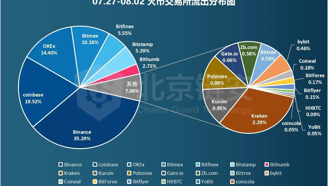 火幣的流入和流出節奏也與幣安相仿,但是整體變化更為穩定,同樣的凈流出額大幅減少,但是暫時未能改變凈流出的態勢。三大交易所流出分布:在過去一周,交易所之間的比特幣來往又呈現怎樣的分布呢?我們將幣安、火幣、OKEx三大交易所流出到各交易所的比例在這里也向各位呈現。
