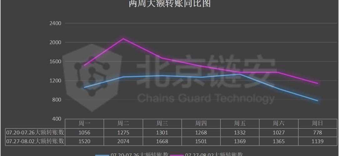 交易數、活躍地址在行情中變化不大,這個現象我們此前解釋過,主要因為當前比特幣交易的核心還是中心化交易所,所以伴隨幣價變化,主要交易依然在場內進行。這期間,涉及用戶沖提幣的操作,也主要會通過交易所的熱錢包的大額歸集的批量交易體現,所以在交易數和活躍地址上不會有特別的增量。大額轉賬數:07.20-07.26:803707.27-08.02:10636較之前一周上漲:32.34%詳細數據圖如下: