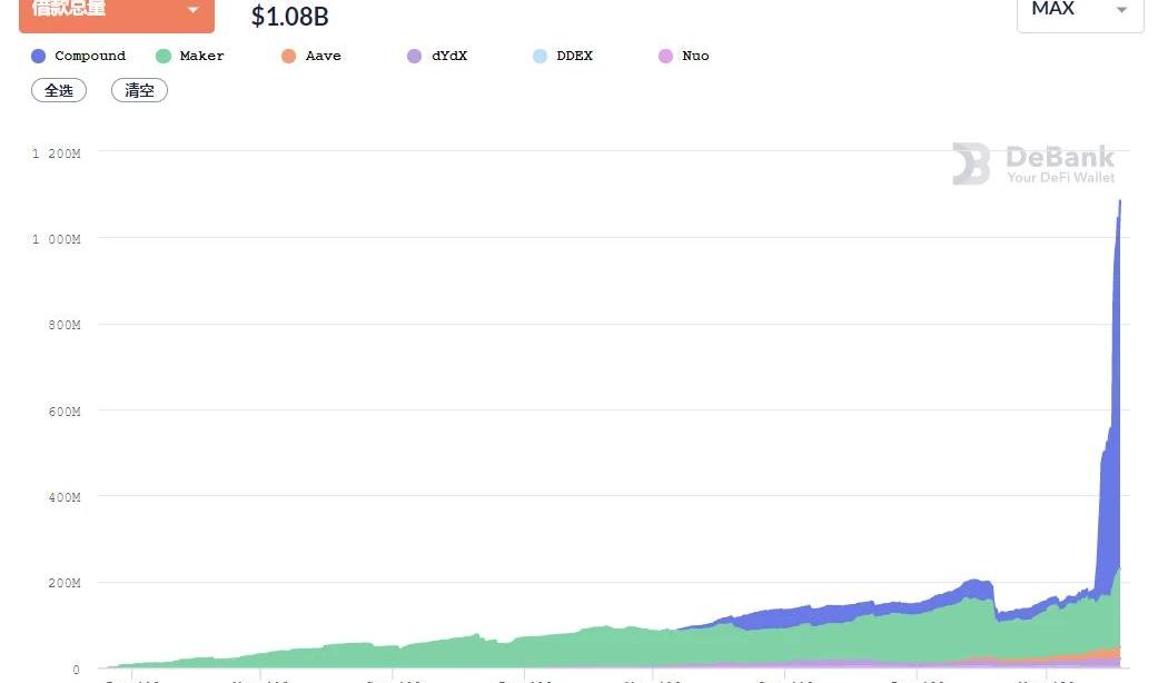 根據上述統計DeFi生態中鎖定的BTC和ETH量,分別是:ETH鎖倉資產量為:3,749,645枚,即價值9.2億美元;BTC鎖倉的資產量為:14,509枚,價值1.36億美元。這兩者加起來為:10.36億美元,也就是說穩定幣+各類ERC資產鎖定在DeFi中的資產為13.24億美元。而根據DeBank數據顯示,加密市場的借貸量為10.8億美元。其中,Compound的借款總量位列第一,約8.27億,占比79.1%,Maker居第二,為1.81億,Aave居第三,為0.27億。