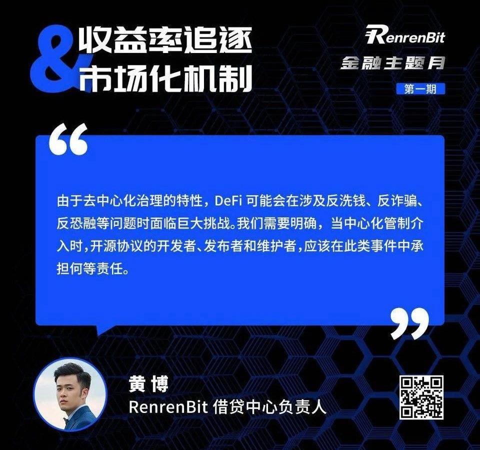 湯洪波:這些產品上的優勢其實會為DeFi創造出相對比CeFi的一些優勢,同時因為DeFi產品間的賬戶都是互通的,所以我個人很看好各種金融產品創新會帶來的用戶增量,最后這些用戶的借貸需求很可能就會沉淀在鏈上的DeFi協議里。所以DeFi想要增長,暫時看起來不太會是靠跟傳統的CeFi拼產品體驗,而是更多的專注于金融創新為主。田川主編:可以補充一下CeFi和DeFi結合的發展方向上,有哪些創新點值得去做?黃博:其實大家一直在爭論CeFi跟DeFi到底哪個才是最終的發展方向,首先兩種產品對用戶而言是多了一種選擇,無論中心還是去中心,最終的目標是為用戶創造價值,滿足用戶需求。金融涉及到融資,涉及到大量的資金的轉移,它是跟人性、欺詐等違法行為密切相關的。可以這么理解,只要涉及到融資的問題,就沒有辦法純粹依靠市場的自發行為,現階段來說的話我覺得一定需要中心化的強力介入,我們看到目前的DeFi項目,技術本身是去中心化的,但是治理卻無法脫離開中心化的機制。CeFi跟DeFi各自的優缺點剛才大家也都討論了,我認為隨著從業人員不斷的創新與嘗試,還有區塊鏈整體的基建發展,未來兩條平行的線會交匯到一起,具體說創新的點有哪些,我覺得這也是我們所有從業人員所要一直探索的。黃博:我們其實從18年就開始探索DeFi了,他的透明機制,不可篡改在我們現在的業務里是急需的,我們推出100%保證金也是中心化的一種自監管嘗試,因為在這個行業做中心化應用自證是件很難的事情,具體說結合點就是我們在嘗試用中心化的用戶體驗去中心化的數據流轉。金融主題月第一期「收益率追逐與市場化機制」AMA正式結束,想了解更多關于金融主題月的內容,可加入「RenrenBit的朋友們」社群,我們下期再會。以下是嘉賓觀點片段整理: