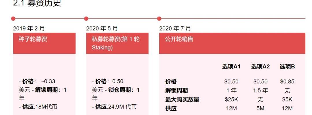 對于想參與公募的用戶,有三個購買選項:選項A1:以0.5美元/枚價格出售,一年內按季度進行解鎖,購買上限為2.5萬美元。選項A2:以0.5美元/枚價格出售,一年半內按季度進行解鎖,無購買限制。選項B:以0.85美元/枚價格出售,無鎖定期,最大購買限額為5000美元。詳細的供應量與過往的募資價格如下圖: