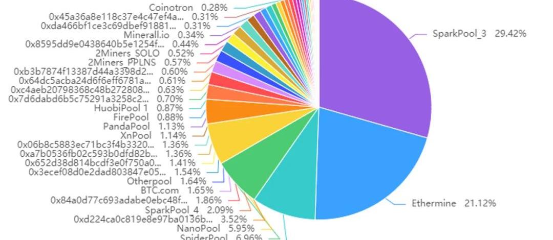 以太坊全網HashRate圖2020-7-7日(數據來源:Etherscan)ETH產品的算力市場中,主要份額由Sparkpool,Ethermine,F2Pool,SpriderPool,NanoPool等礦池與小型曠工共同占有,其中SparkPool與Ethermine占據了約50.5%的算力市場份額。近1個月以來的礦工區塊市場份額分布圖如下所示: