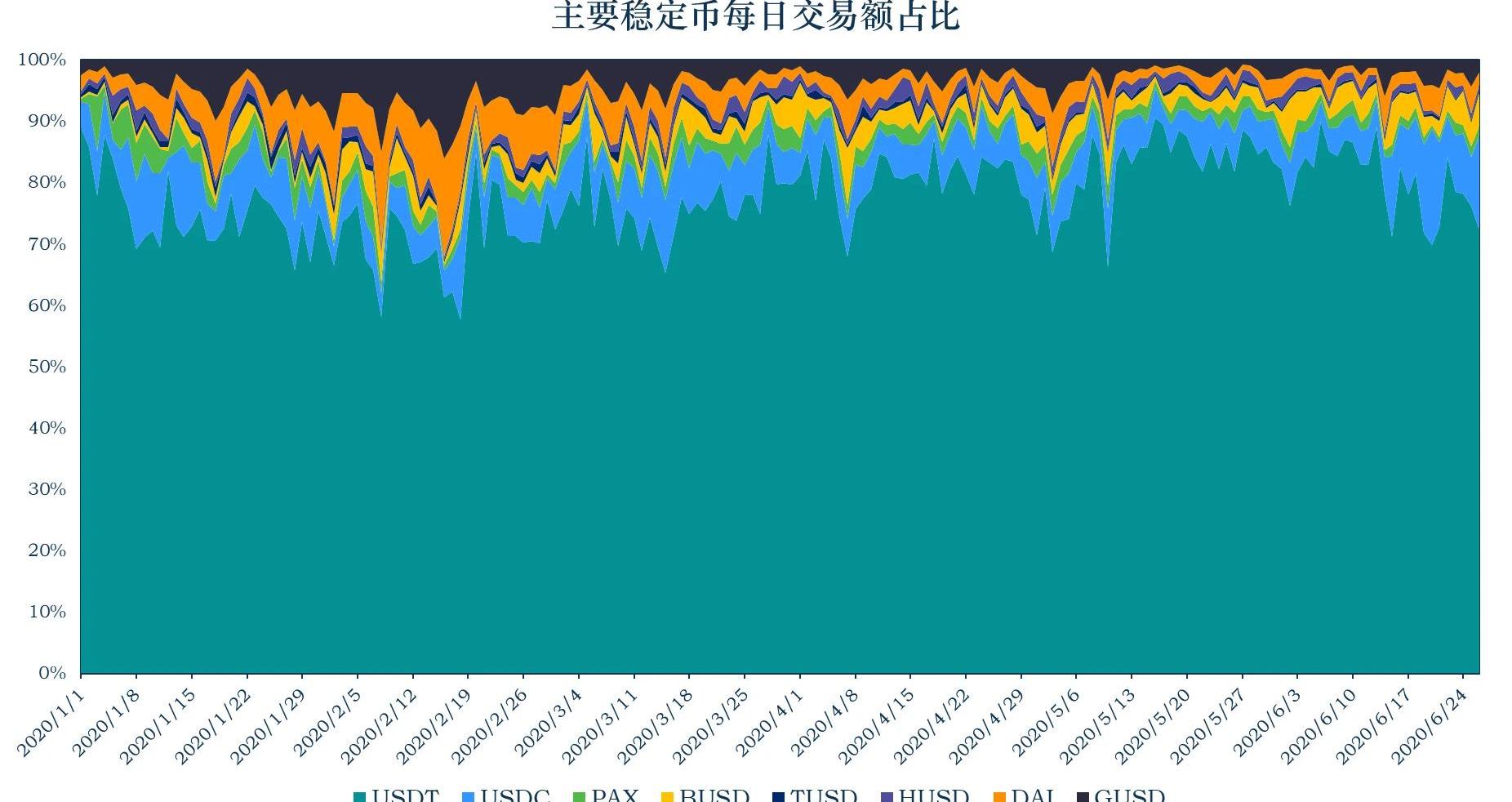 來源:CryptoCompare1.市場規模通常情況下,穩定幣的規模越大,穩健性越好,資產的流動性、應用的廣度、用戶數量等都會相對更好。規模越大的穩定幣也越容易產生網絡效應,從而吸引更多的用戶。穩定幣的規模總體呈上升趨勢,并從今年3月份開始加速。目前,穩定幣市場有99.56億USDT、9.53億USDC、2.42億PAX、1.64億BUSD、1.44億TUSD、1.17億HUSD、1.07億DAI、862萬GUSD。USDT占穩定幣市場份額的85.15%,USDC占8.15%,PAX占2.07%,BUSD占1.41%,TUSD占1.23%,HUSD占1.00%,DAI占0.92%,GUSD占0.07%。